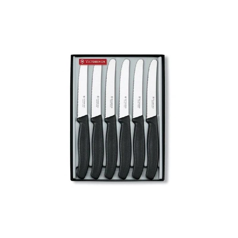 Ce coffret contient 6 couteaux de table Victorinox SwissClassic dotés de lames de 11cm de longueur avec bouts arrondis. Tranchants, ils permettent de couper tous les aliments sans effort : de quoi imiter les gestes des plus grands chefs cuisiniers avec facilité. Autre bon point, ces couteaux de table Victorinox SwissClassic sont munis de manches noirs ergonomiques : autrement dit ils sont agréables à manipuler au quotidien.