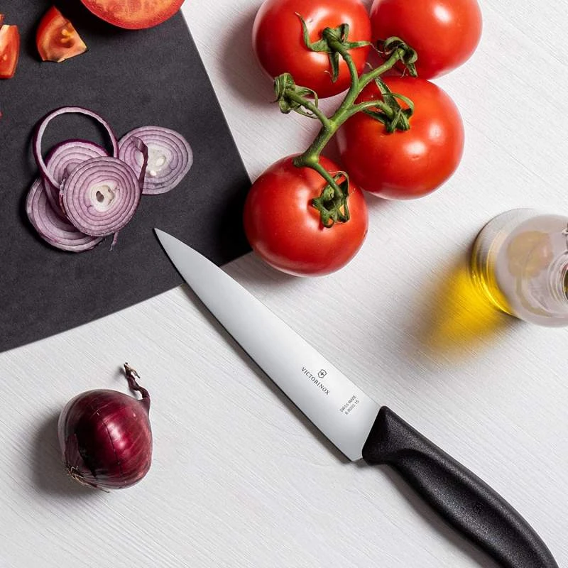Livré sous blister, ce couteau à découper Victorinox SwissClassic sera parfait pour offrir à un apprenti cuisiner ou boucher. Il se dote d’un manche en fibrox noir assurant une prise en main tout simplement exceptionnelle. Les apprentis bouchers pourront exécuter des gestes toujours très précis permettant d’imiter aisément ceux des plus grands chefs. Côté lame, elle est très tranchante et conçue en acier inoxydable : vous avez le choix sur la longueur de cette dernière : 15, 19, 22 ou 25cm. Ce couteau de boucher Victorinox vous permettra de découper facilement les viandes, volailles et rôtis.