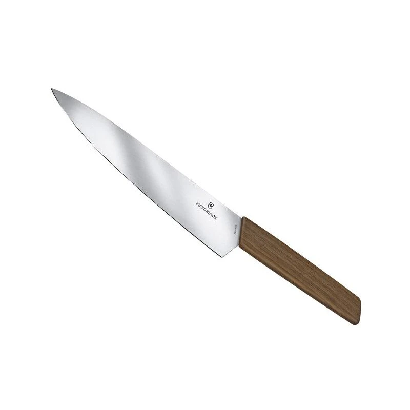 Avec la collection Swiss Modern, Victorinox a conçu des couteaux de cuisine à la fois modernes et efficaces. Et ce couteau de chef ne déroge pas à la règle, bien au contraire. Il est muni d’un joli manche en bois noyer avec veinures fines apparentes : il a beaucoup de charme. Et en plus d’être élégant, le manche en bois noyer est également très agréable à manipuler au quotidien : les cuisiniers expérimentés vont pouvoir exécuter des gestes précis avec la plus grande facilité. Cela est possible du fait que le manche est doté d’une forme géométrique qui s’agrippe facilement.