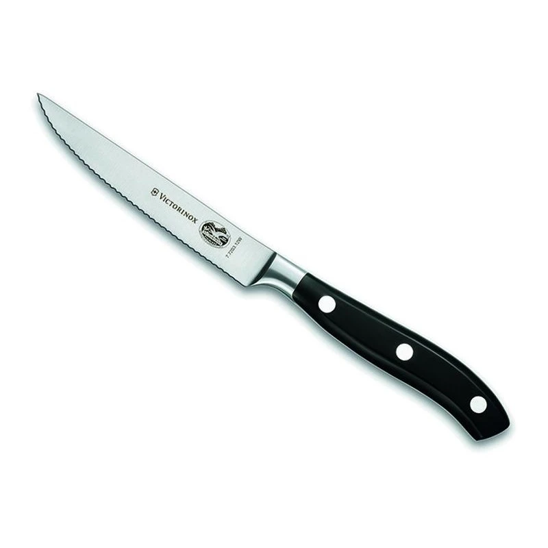 Ce couteau à steak Victorinox « Grand Maître » avec cette fois-ci une lame non pas lisse, mais dentée et forgée (double affûtage et contrôle laser). Toujours plus tranchante, la lame forgée de 12cm avec dents permettra de pouvoir trancher sans effort les viandes et steaks. Le manche ergonomique en POM (Polyoxyméthylène) assure une prise en main toujours exceptionnelle : le couteau tient très bien dans la main et permettra d’exécuter des gestes toujours très précis. Vous allez pouvoir imiter facilement les bouchers professionnels !