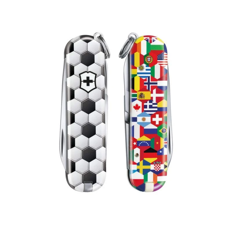 Les footballeurs et footballeuses apprĂ©ciant les couteaux suisses Victorinox ne pourront qu’apprĂ©cier le Classic World of Soccer, une Ă©dition limitĂ©e de l’annĂ©e 2020. Un canif onglier de 7 fonctions qui s’adresse Ă tous les passionnĂ©s du ballon rond, d’ailleurs le design avant de la paire de cĂ´tes est dĂ©corĂ© de la mĂŞme façon que le très cĂ©lèbre ballon de football. On retrouve aussi le logo Victorinox, Ă savoir la croix Suisse, se fondant parfaitement dans le dĂ©cor, puisque de couleurs blancs/noirs. Au dos du manche du Victorinox Classic World of Soccer, on peut observer de nombreux pays ayant participĂ©s Ă la « Coupe du monde de Football« , compĂ©tition la plus prestigieuse de ce sport extrĂŞmement populaire.