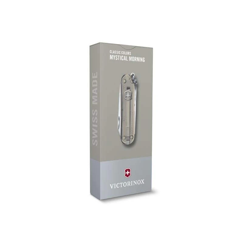 Pas besoin d’ĂŞtre du matin pour apprĂ©cier la beautĂ© et la polyvalence de ce couteau suisse Classic SD Mystical Morning. Sa principale caractĂ©ristique, c’est son manche gris translucide sur lequel on observe la croix Victorinox sans oublier le nom du fabricant sur le cĂ´tĂ©. La paire de cĂ´tes mesure 58mm de long, une petite taille permettant de la glisser aisĂ©ment dans une poche ou dans un sac. Cela permet de mettre Ă votre disposition une multitude de fonctionnalitĂ©s lors de vos dĂ©placements quotidiens.