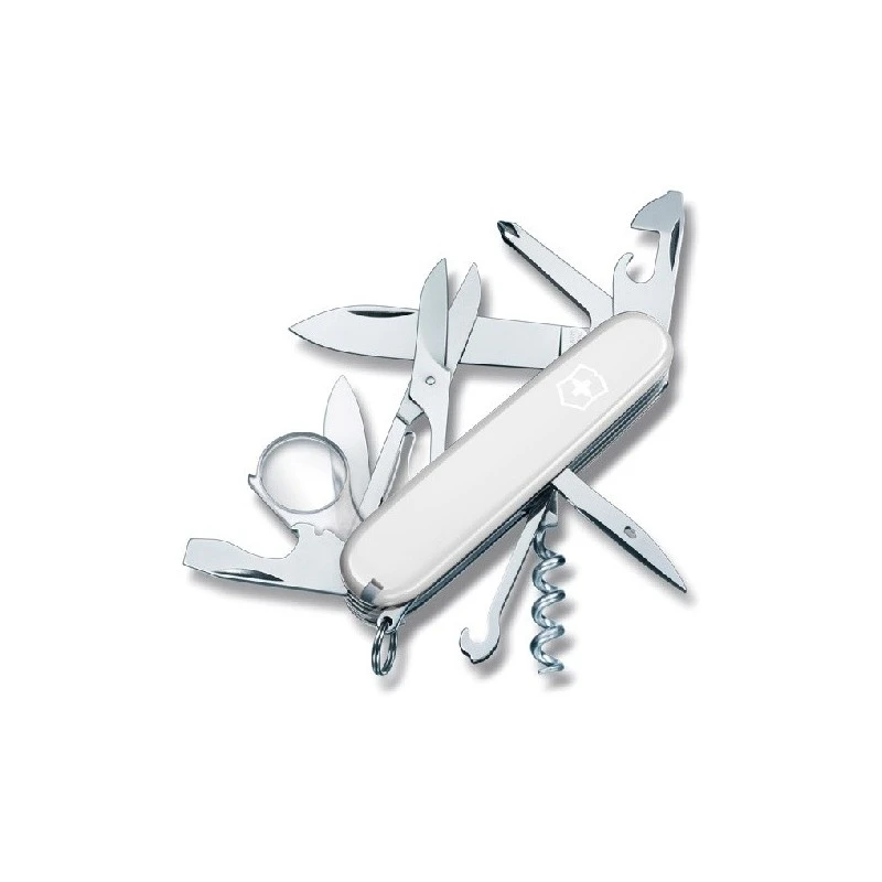Le couteau Victorinox Explorer dans sa version blanche. Pièce rare dans cette couleur, ce couteau suisse propose toutes les fonctionnalitĂ©s de base (grande lame, petite lame, ouvre-boĂ®tes, tire-bouchons, tournevis) ainsi que des accessoires amovibles comme la pincette, le cure-dent et le stylo. D’autres outils comme le dĂ©capsuleur tournevis, le crochet ou le poinçon rĂ©pondront Ă un grand nombre de situations. Mais lorsqu’on part Ă l’aventure, il est très important d’avoir une loupe pour observer le milieu naturel avec beaucoup plus de prĂ©cision : ça tombe bien, l’Explorer blanc en intègre une. Avec lui, vous allez pouvoir partir explorer de nouvelles terres avec un Ă©quipement aussi redoutable que peu encombrant.