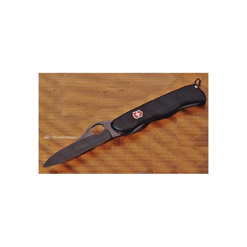 Des pincettes et un cure-dents (sous les cĂ´tes) complètent ce tout dernier modèle entièrement noir. Ce couteau suisse Sentinel Black Serie est Ă©galement muni d’un anneau en acier inoxydable placĂ© au bout du manche noir (traitement de suface Ebonol® noir anti-reflets) : il sert Ă accrocher le couteau suisse Ă votre trousseau de clefs. Mais lĂ ou ce modèle entièrement noir fait très fort : c’est qu’il dispose Ă©galement d’une grande lame Ă cran intĂ©rieur au tranchant 2/3 ondulĂ© pouvant ĂŞtre ouverte d’une seule main grâce Ă la prĂ©sence d’un trou : elle permet d’ĂŞtre rĂ©actif en cas de danger.