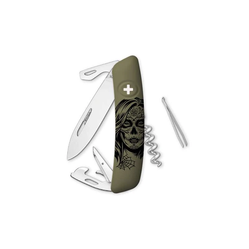 Ce couteau suisse Swiza, modèle D03, est comme vous l’aurez remarqué de couleur vert olive, il intègre toujours un soft grip apportant de la douceur au toucher tout en conférant une résistance optimale face aux rayures. De longueur 95mm pour une facilité de port à toute épreuve, la poignée olive est décorée par un motif girls skull que l’on peut traduire par tête de mort de femme, ou crâne féminin si vous préférez. On peut même apercevoir une toile d’araignée au niveau de la partie basse des cheveux, ce qui vient accentuer davantage le côté épouvante. À noter qu’au-dessus du crâne, se trouve un bouton croix qui sert à déverrouiller la lame.