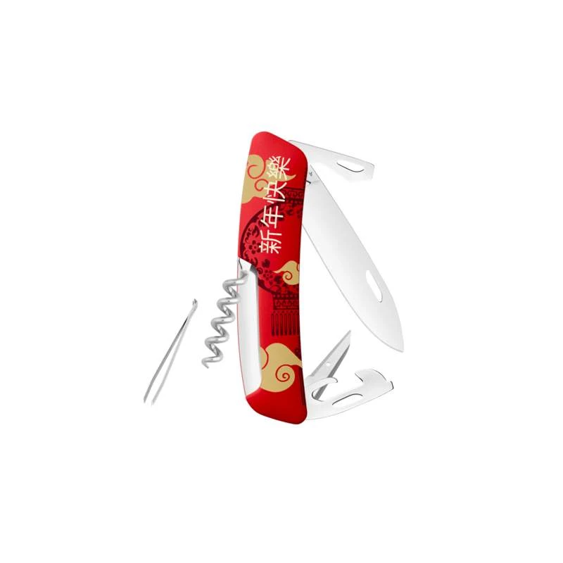 En terme d’esthétique, ce couteau suisse Swiza D03 est exactement le même que le Swiza D01 rouge Nouvel An Chinois 2019. Avec un manche rouge de forme incurvée décoré par de nombreux motifs Chinois avec bien évidemment un cochon mis en avant car c’est l’animal de l’année 2019 en Chine. Un manche au design extrêmement raffiné avec de belles décorations au niveau des deux faces (recto/verso). Pour information ce couteau suisse Swiza D03 rouge du Nouvel An Chinois 2019 mesure exactement 95mm de longueur ce qui lui assure une facilité de transport en toutes circonstances. On remarque également la présence d’un bouton croix qui sert à verrouiller la lame en position ouverte ou fermée (sécurité en utilisation ou durant le transport).