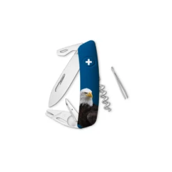 Ce couteau suisse Swiza, modèle Tick Tool TT03, possède un manche incurvé d’un joli coloris bleu nuit, une couleur bleue relativement sombre. Au niveau de la partie inférieure de la face avant, on observe un aigle, cet incontournable rapace aux grandes ailes doté d’un corps noir ainsi qu’une tête blanche avec bec jaune pour un contraste parfait. Au verso du manche, se trouvent de nombreuses silhouettes représentant très certainement des aigles en plein vol.