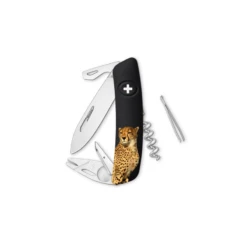 Swiza Tick Tool TT03 oblige, ce modèle guépard, coloris noir, est pourvu de 11 fonctionnalités, avec en vedette l’outil tire-tique accompagné de sa loupe de contrôle. Un outil qui vous l’aurez compris, permet de retirer les tiques de la peau des êtres humains et animaux. Un puissant allié pour tous les mordus d’aventures et de sports Outdoor ! Bien sûr, on retrouve également d’autres fonctionnalités plus ordinaires, type tournevis, pincettes, tire-bouchons, décapsuleur, poinçon … Le détail est expliqué clairement à l’aide d’un schéma en bas de page. Des outils que vous pourrez ouvrir avec une rapidité tout simplement incroyable digne de la course d’un guépard. Un couteau suisse ergonomique, polyvalent, transportable signé Swiza, pour les droitiers et les gauchers ! Existe aussi avec d’autres motifs animaliers.