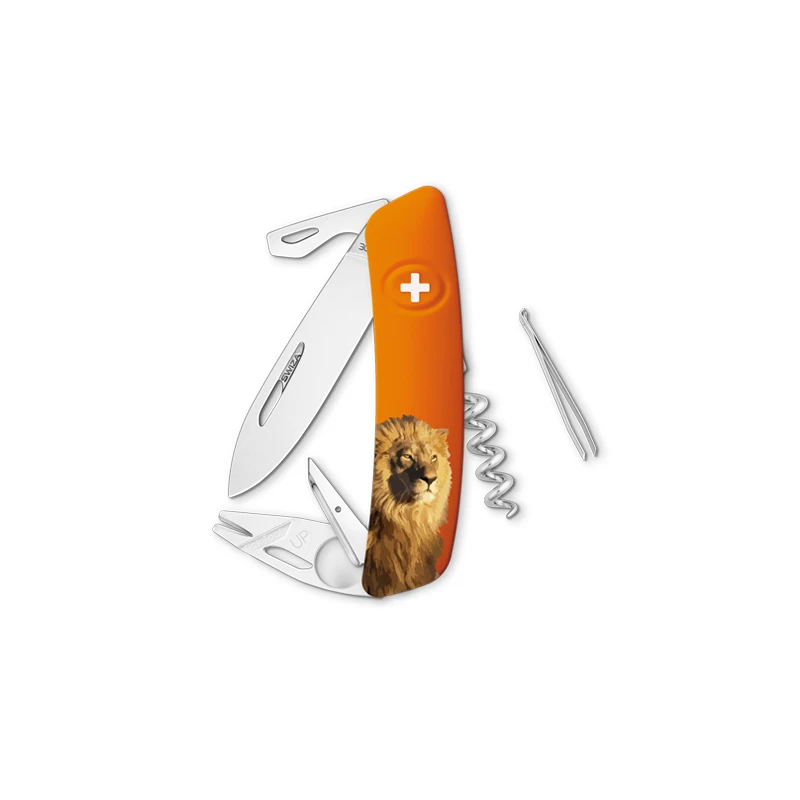 Symbole de force et de puissance, le lion est un animal de la savane que l’on reconnaît facilement pour sa crinière si caractéristique. De couleur orange, ce couteau suisse Swiza Tick Tool TT03 est justement décoré par un motif lion au niveau de la partie inférieure de la face avant. Un lion, qui comme vous pouvez le constater, a fière allure avec un regard déterminé et porté vers l’avenir. La couleur orange du manche incurvé peut faire penser à la savane Africaine au moment du coucher de soleil, un coloris moderne pour un style très contemporain. Ce couteau suisse Swiza, modèle Tick Tool TT03, pourra par exemple s’offrir aux amis dont le signe astrologique est le lion bien sûr. Gardez bien à l’esprit que la lame de 75mm en acier 440 peut être personnalisée (gravure d’un texte au choix).