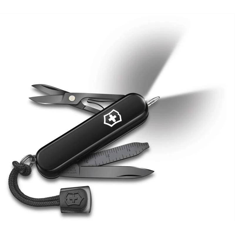Le Signature Lite Onyx Black 0.6226.31P est un couteau suisse Victorinox dont les outils phares sont la lame, le stylo bille pressurisĂ© mais surtout la petite lampe led pour Ă©clairer dans l’obscuritĂ©. Vous l’aurez compris, avec lui, il sera aisĂ© de prendre des notes, mĂŞme dans le noir ! Si le Victorinox Signature Lite Ă©dition Onyx Black est performant la nuit, il en va de mĂŞme le jour grâce Ă son tournevis, sa paire de ciseaux ainsi que sa règle pour prendre des mesures avec prĂ©cision. On soulignera la prĂ©sence d’un cordon noir rendant la transportabilitĂ© encore meilleure, chose qui Ă©tait dĂ©jĂ le cas (longueur du manche : 58mm, poids : 24g). Un indispensable pour affronter le quotidien ! Ce couteau suisse Victorinox Signature Lite vous sera livrĂ© dans son coffret cadeau Onyx Black Collection.
