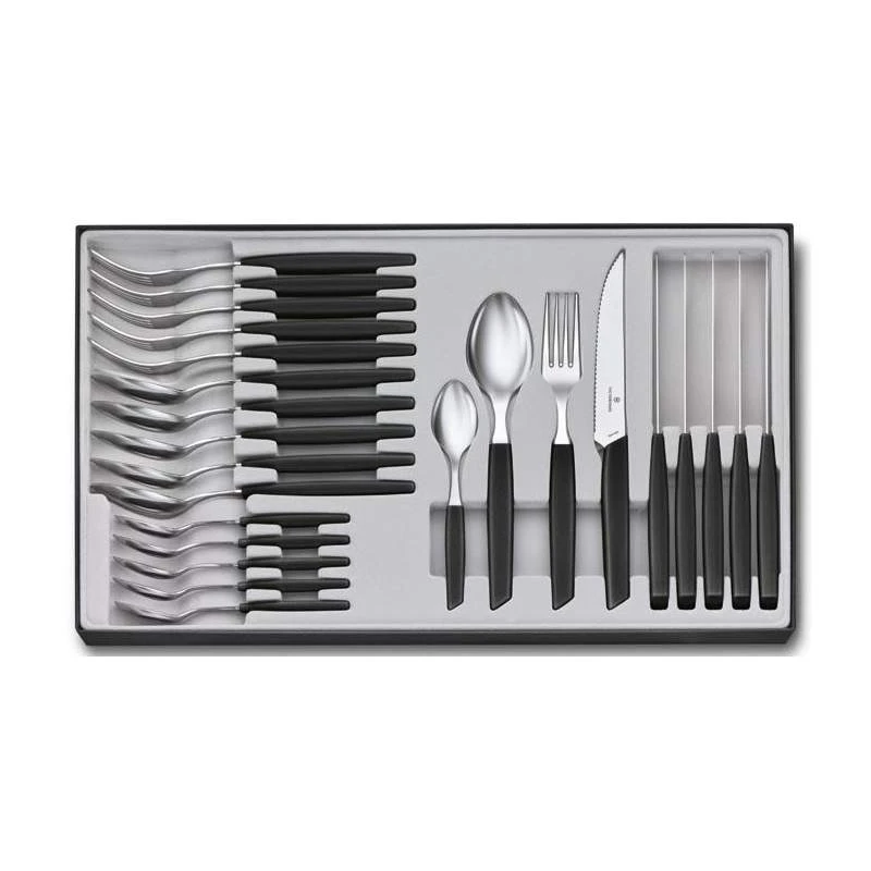 Pour habiller votre table de beaux couverts aussi élégants que fonctionnels, cette ménagère Victorinox se révèle être redoutable. Elle fait partie de la collection Swiss Modern de la marque Suisse, qui se distingue par son style contemporain, ou encore moderne si vous préférez. Les 24 pièces sont toutes fabriquées en acier inoxydable afin de garantir une parfaite résistance à la corrosion, les manches eux sont faits de polypropylène coloris noir ce qui garantit une facilité d’utilisation. En effet, ce matériau offre une excellente ergonomie en raison de sa surface antidérapante, peu de chance que la main ne vienne glisser à l’usage. La couleur noire est à la fois sobre et élégante, elle n’aura aucun mal à s’harmoniser, se marier avec le style de votre table. Si vous avez l’intention d’acheter cette ménagère, vous avez probablement envie de connaître sur le bout des doigts son contenu que voici :
