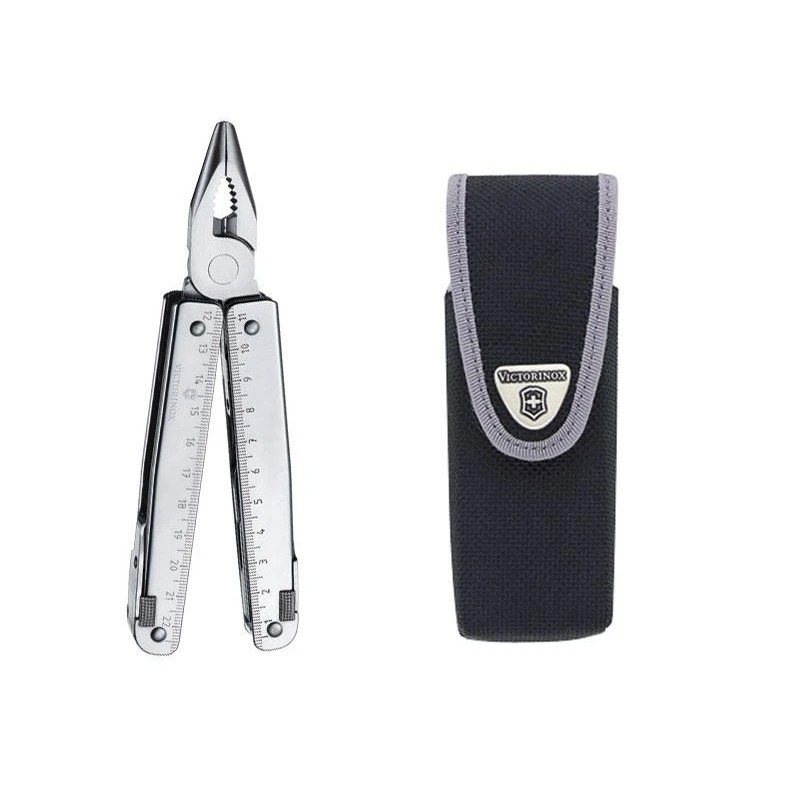 Il n’y a qu’une seule chose qui différencie ce Victorinox Swisstool de son frère : l’étui de rangement. En effet, sur ce modèle, c’est un étui en nylon Victorinox qui permettra de pouvoir protéger le couteau suisse des chocs durant les voyages et déplacements. Un bel étui de protection élégant qui vous assure de toujours avoir votre pince Swisstool à vos côtés : vous ne serez plus jamais seul. Un danger en approche ? Il suffira d’ouvrir l’étui en nylon pour agripper le multifonction et le tour est joué. En plus, il est très ergonomique (agréable à prendre en main) et permet d’accéder directement aux outils du couteau suisse sans devoir ouvrir la pince. Un système bien pensé qui permettra à l’utilisateur d’être toujours plus réactif. Il faut également souligner le fait que les outils sont bloqués une fois ouverts, de quoi apporter encore plus de sécurité en utilisation. Sinon, ce Victorinox Swisstool en acier inoxydable est toujours équipé de ses 26 fonctionnalités différentes.