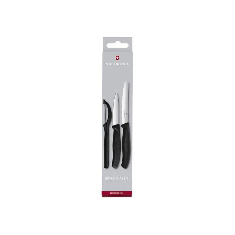 Voilà un joli cadeau à offrir à tous les mordus de cuisine, qui va beaucoup aider lors de la préparation des fruits et légumes, de l’épluchage jusqu’à la découpe. Il s’agit d’un set composé de 3 pièces appartenant toutes à la collection SwissClassic de la marque Suisse Victorinox. Un trio gagnant qui se compose de deux couteaux d’office (lame lisse 8cm et crantée 11cm) ainsi qu’un éplucheur universel. Tout le matériel de cuisine nécessaire pour préparer de bons petits plats ! Précision importante : tous les ustensiles du set 3 pièces Victorinox SwissClassic (6.7113.31) sont pourvus de manches noirs en polypropylène de forme ergonomique afin d’assurer du confort lors de chaque prise en main. Le coloris noir assure également de la modernité avec un trio qui s’harmonisera parfaitement avec une cuisine moderne/contemporaine. Cerise sur le gâteau, les deux couteaux d’office Victorinox SwissClassic ainsi que l’éplucheur universel peuvent être lavés au lave-vaisselle pour une facilité d’entretien à toute épreuve ! Voici le contenu détaillé du set :