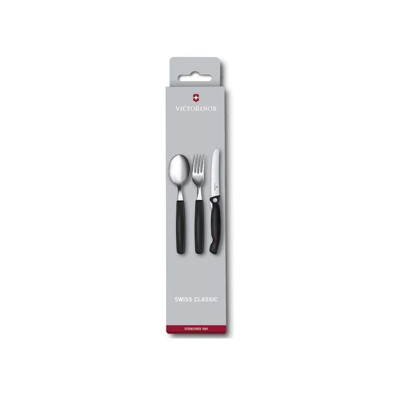 Que ce soit pour le pique-nique ou tout simplement pour manger la gamelle au bureau, ce set Victorinox SwissClassic 6.7192.F3 va rapidement devenir un indispensable. Il se compose de 3 pièces, toutes dotĂ©es d’un manche en polypropylène noir confĂ©rant confort de prise en main et facilitĂ© d’entretien (les 3 pièces sont compatibles avec le lave-vaisselle). Dans la boĂ®te, vous trouverez une fourchette, une cuillère Ă soupe ainsi qu’un couteau d’office. Ce dernier a la particularitĂ© d’ĂŞtre pliant afin de rĂ©duire l’encombrement, il convient pour la table mais aussi pour cuisiner, notamment les fruits et lĂ©gumes. Le couteau d’office pliant possède une lame crantĂ©e Ă bout rond, son manche noir en PP mesure 13cm de longueur. Vous pouvez personnaliser, par gravure d’un texte, la lame dentĂ©e du couteau d’office. Pratique, l’ensemble peut ĂŞtre contenu dans un Ă©tui plastique afin de pouvoir ĂŞtre transportĂ© de façon plus pratique et plus simple. Également disponible en coloris orange pour une allure plus moderne.