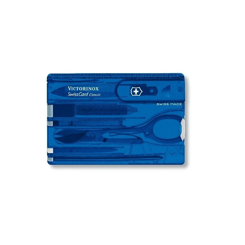 Plus moderne que la Swisscard Classic rouge, ce modèle est entièrement bleu translucide (saphir), de quoi voir les outils au travers. C’est un couteau suisse Victorinox de la même forme qu’une carte de crédit ordinaire (dimensions 82mm x 4,5mm), il pourra donc se ranger très facilement dans un portefeuille ou encore dans un porte-cartes. Avec 10 fonctions différentes au compteur, cette Swisschard Classic bleue vous apportera de la polyvalence à chaque instant de votre vie : il suffira de retirer l’outil de la carte pour en bénéficier. Vous disposerez notamment d’une lame en inox, une paire de ciseaux, une lime à ongles ou encore un stylo bille pour pouvoir signer en toutes circonstances. Ce multifonction bleu intègre également une règle graduée (unité centimètres et pouces) permettant de pouvoir bricoler avec une excellente précision.