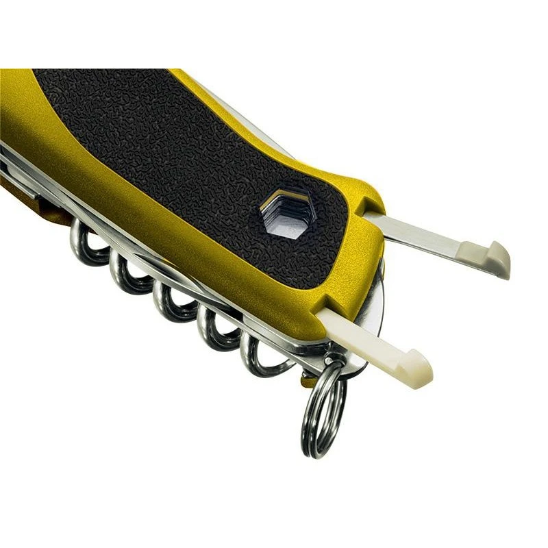 Le Boatsman de Victorinox est un magnifique couteau suisse conçu pour les activités marines, la navigation en mer ou la plaisance. Lorsqu’ils seront à bord du bateau de pêche, les marins apprécieront le fait d’avoir le RangerGrip Boatsman sous la main : il dispose d’un épissoir ainsi qu’un démanilleur qui permettront d’intervenir rapidement sur les cordages et manilles, de quoi pouvoir être réactif en toutes circonstances. En plus de cela, ce couteau intègre également une grande lame en acier inoxydable pouvant être verrouillée en appuyant sur la croix suisse Victorinox présente sur le manche noir et jaune. Ergonomique, il sera très facile de l’utiliser d’une seule main grâce à la présence d’un trou légèrement arrondi : idéal pour agir rapidement en cas de danger sur le bateau.